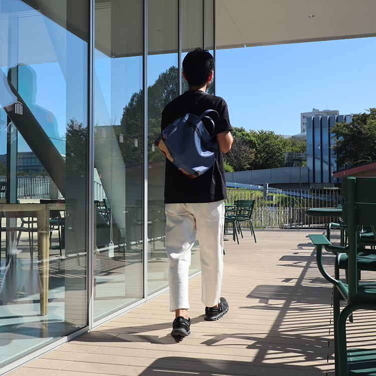トートバッグをざっくり背負う。