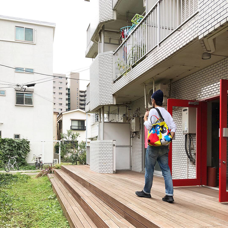 トートバッグをざっくり背負う。