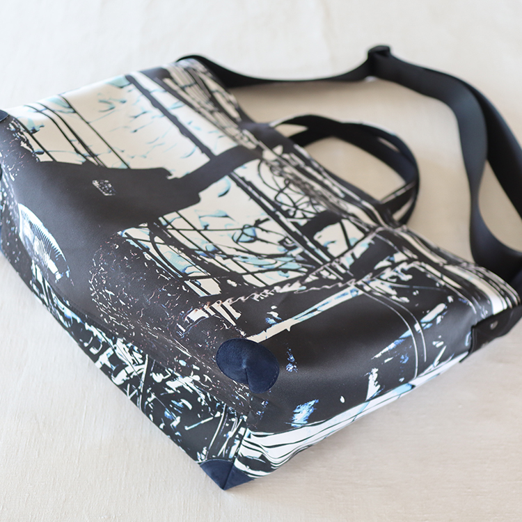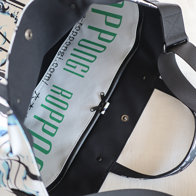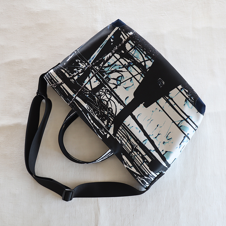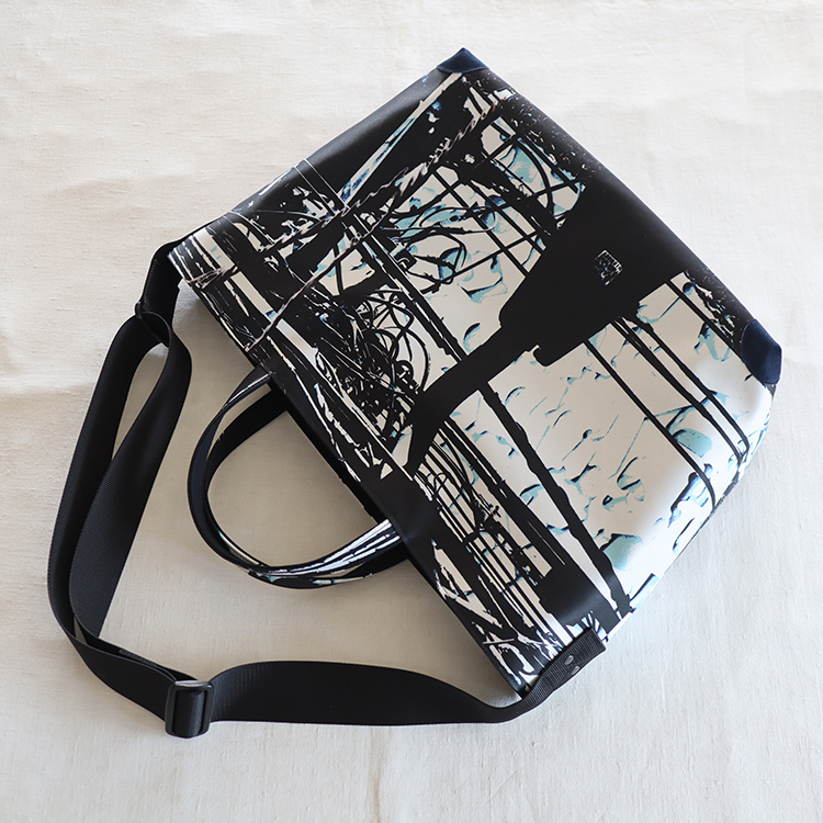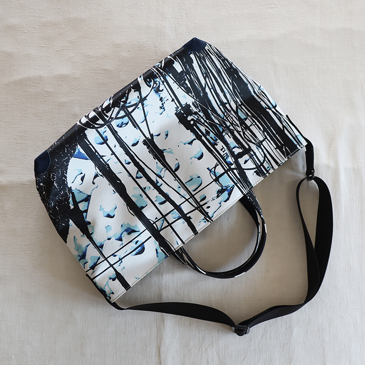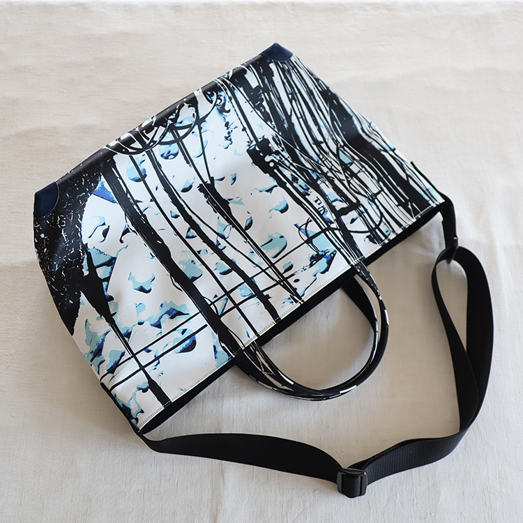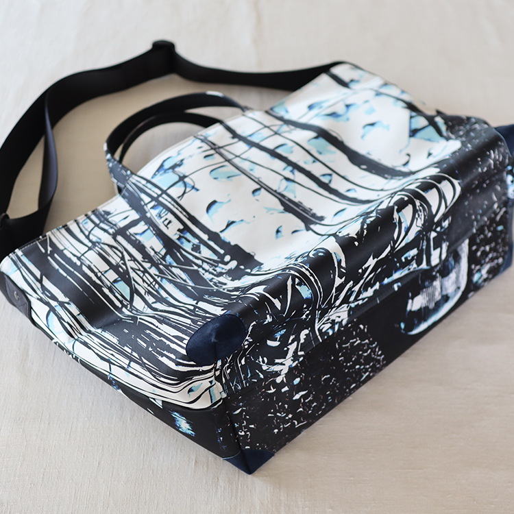 グラフィック・デザインが全面に映える、大きめサイズのショルダーベルト付きトートバッグ。