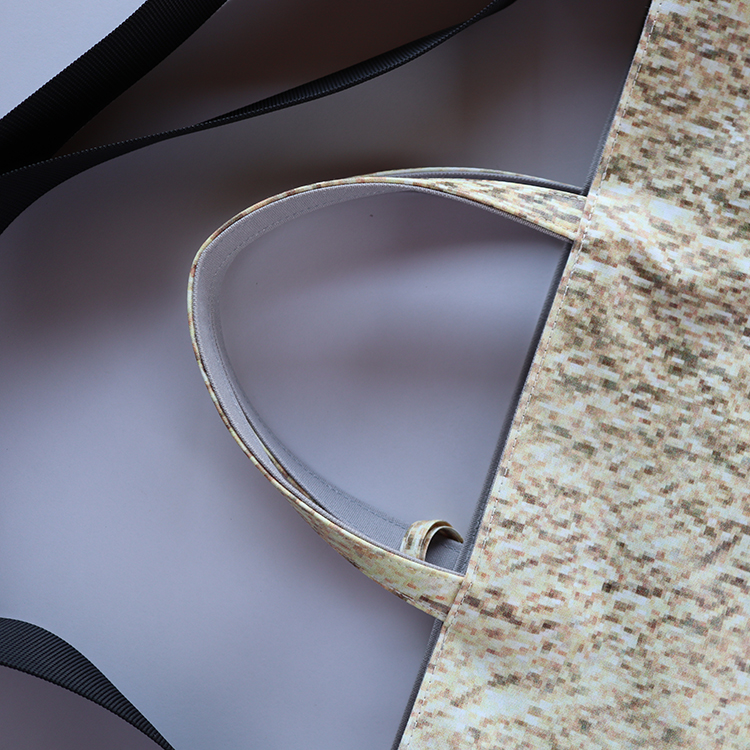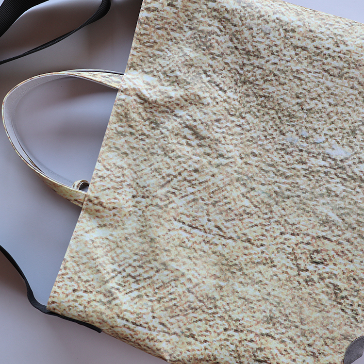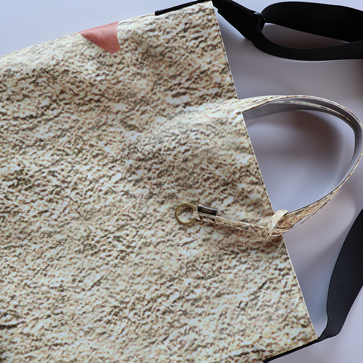 グラフィック・デザインが全面に映える、大きめサイズのショルダーベルト付きトートバッグ。