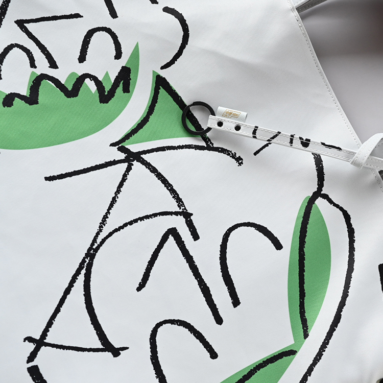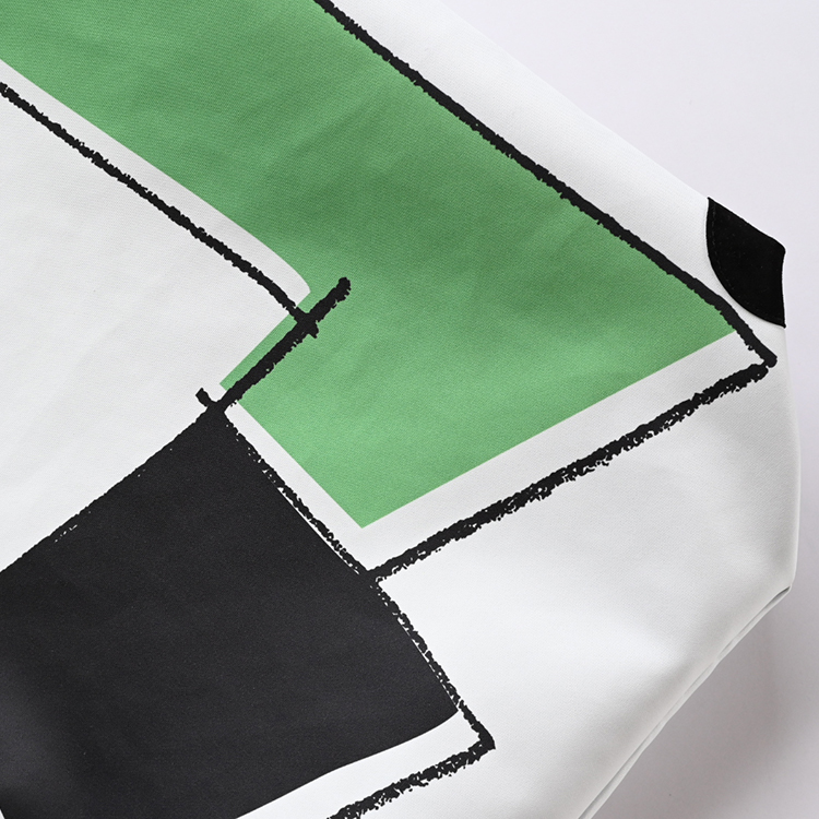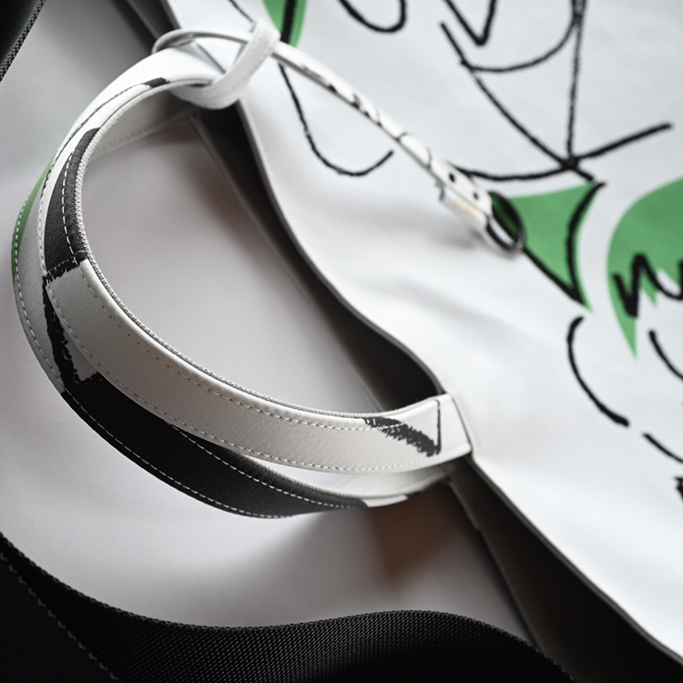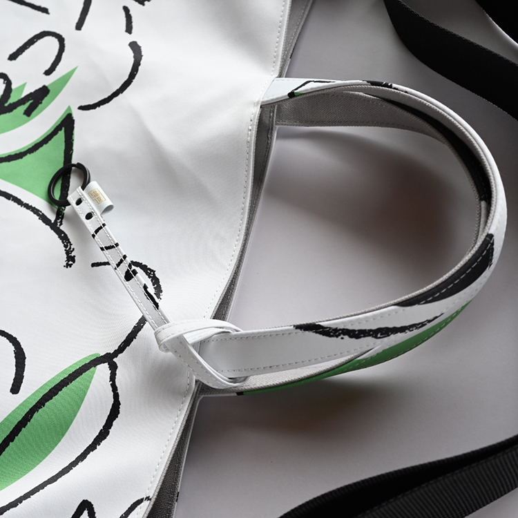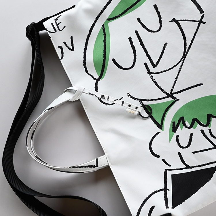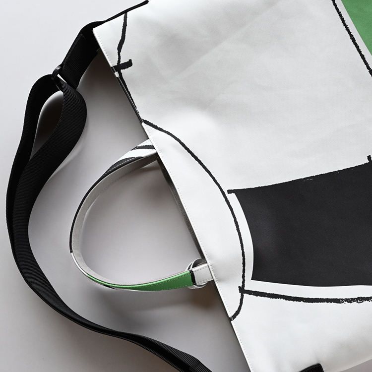 グラフィック・デザインが全面に映える、大きめサイズのショルダーベルト付きトートバッグ。