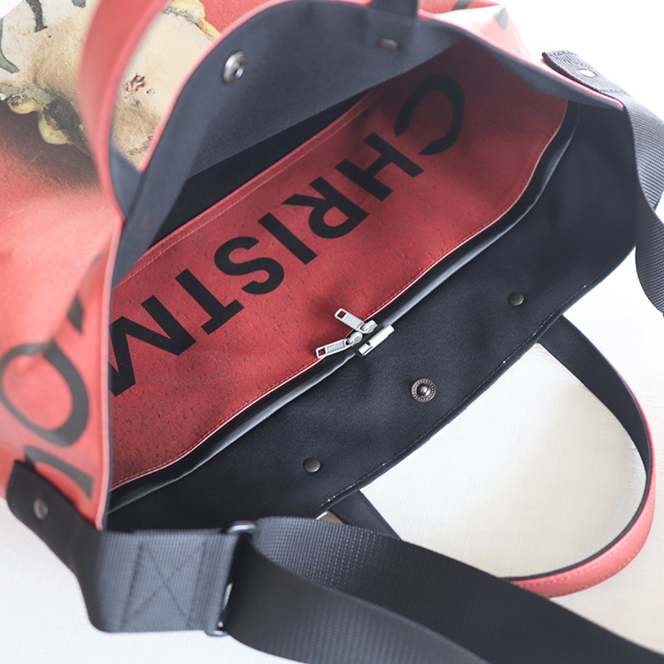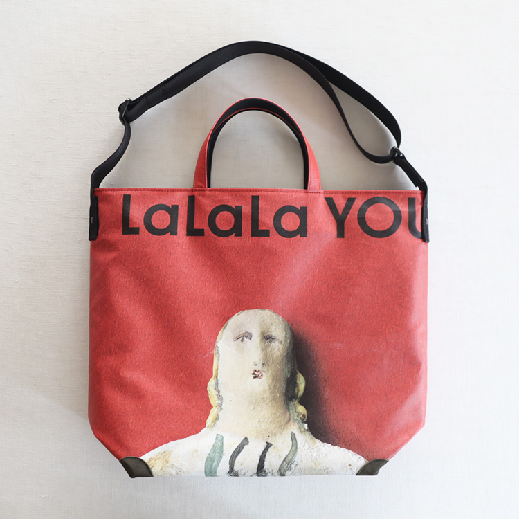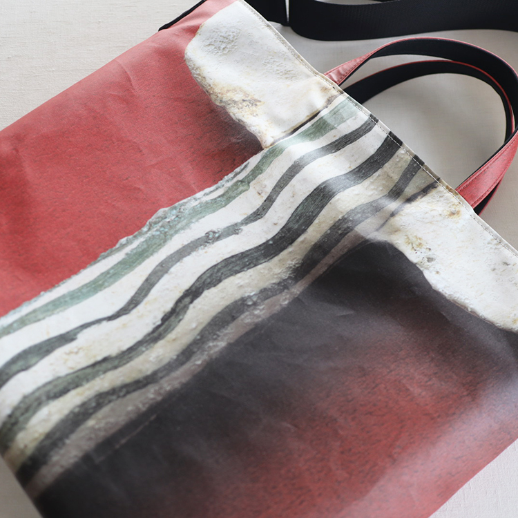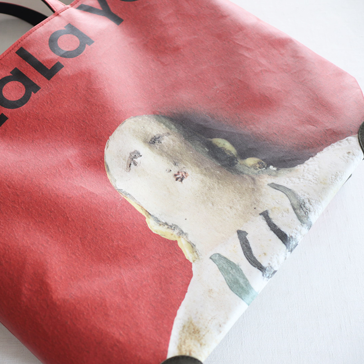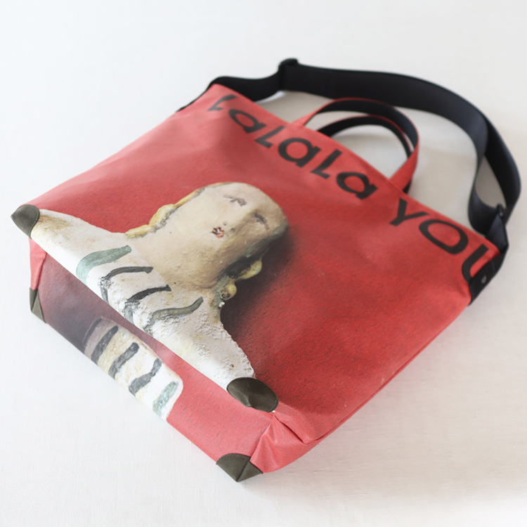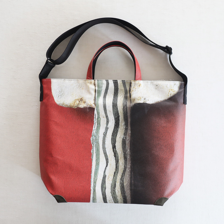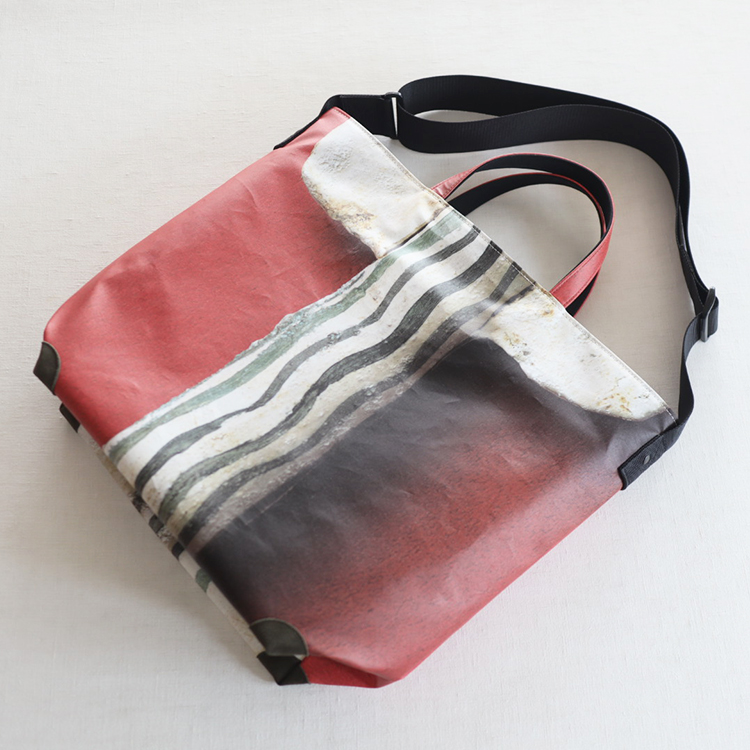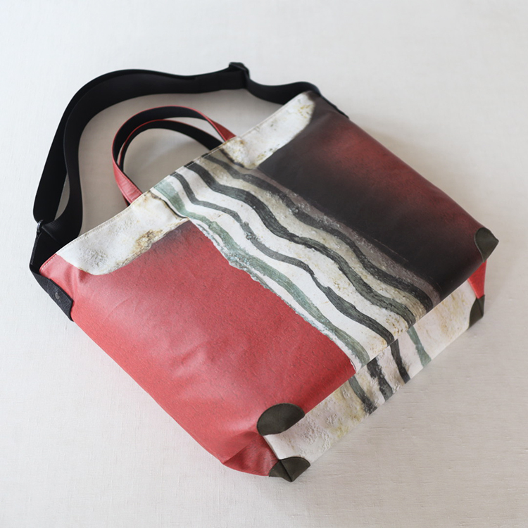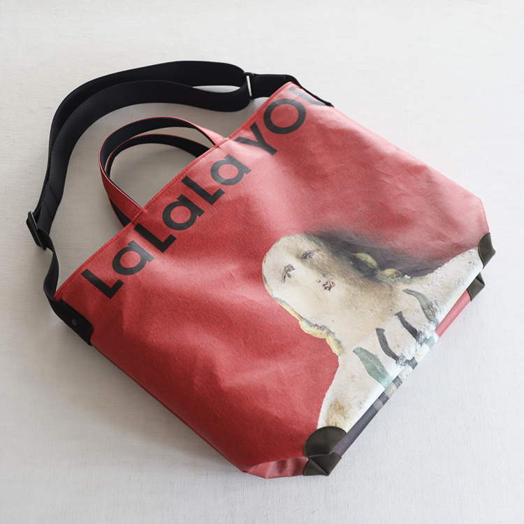 グラフィック・デザインが全面に映える、大きめサイズのショルダーベルト付きトートバッグ。