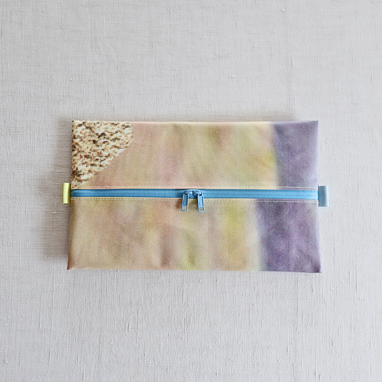 上記の要望を踏まえ、試行錯誤を重ねていると、ポーチの真ん中長手方向に、両開きでファスナーが走るイメージがふと降りてきました。